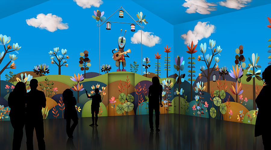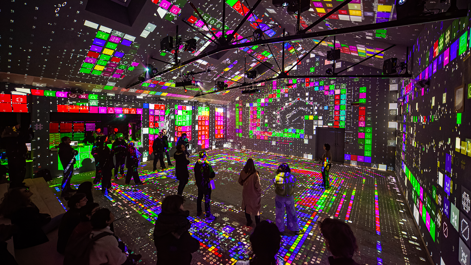 L’Hybride c’est une salle de vidéo mapping immersive, un espace de 170m2 où tu te promènes et tu profites du spectacle qui se passe tout autour de toi, du sol au plafond !